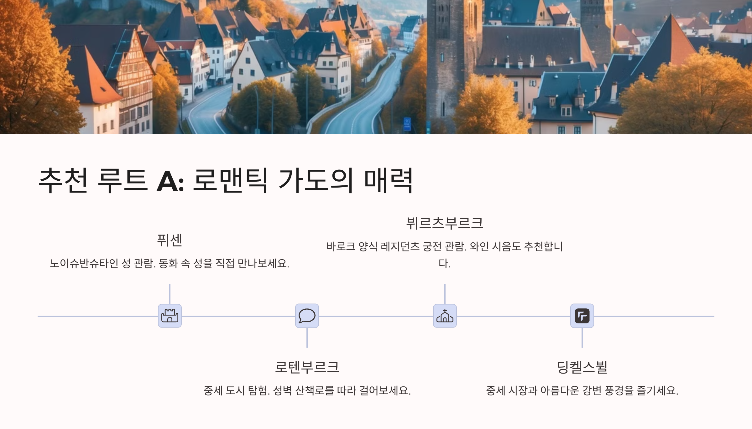 경로는 보통 뮌헨 → 아우크스부르크 → 로텐부르크 옵 데어 타우버 → 뷔르츠부르크 → 퓌센이에요. 이 중 로텐부르크는 하루 숙박하면서 밤마실 꼭 해보세요. 중세 도시 야경이 정말 아름다워요. 퓌센 근처에 숙박하면 다음날 노이슈반슈타인 성 관람도 수월해요.